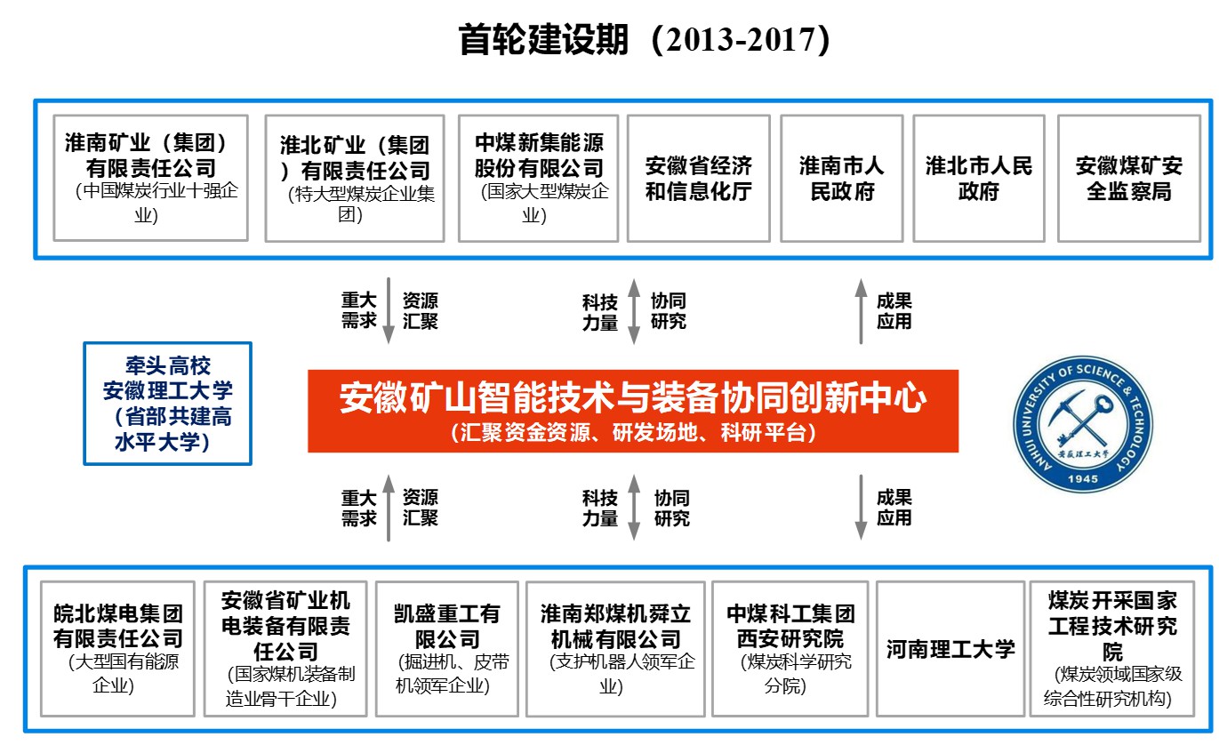 矿山智能技术与装备协同创新中心(以下简称“中心”),2012年由安徽理工大学牵头组建,2013年获安徽省教育厅批准成立,2015年通过验收。在中心的建设基础和成果支撑下,学校2015年获批安徽省智能矿山技术与装备工程实验室、矿山智能装备与技术安徽省重点实验室(2018年验收优秀),2019年获批机械工业联合会矿山采选装备智能化重点实验室。