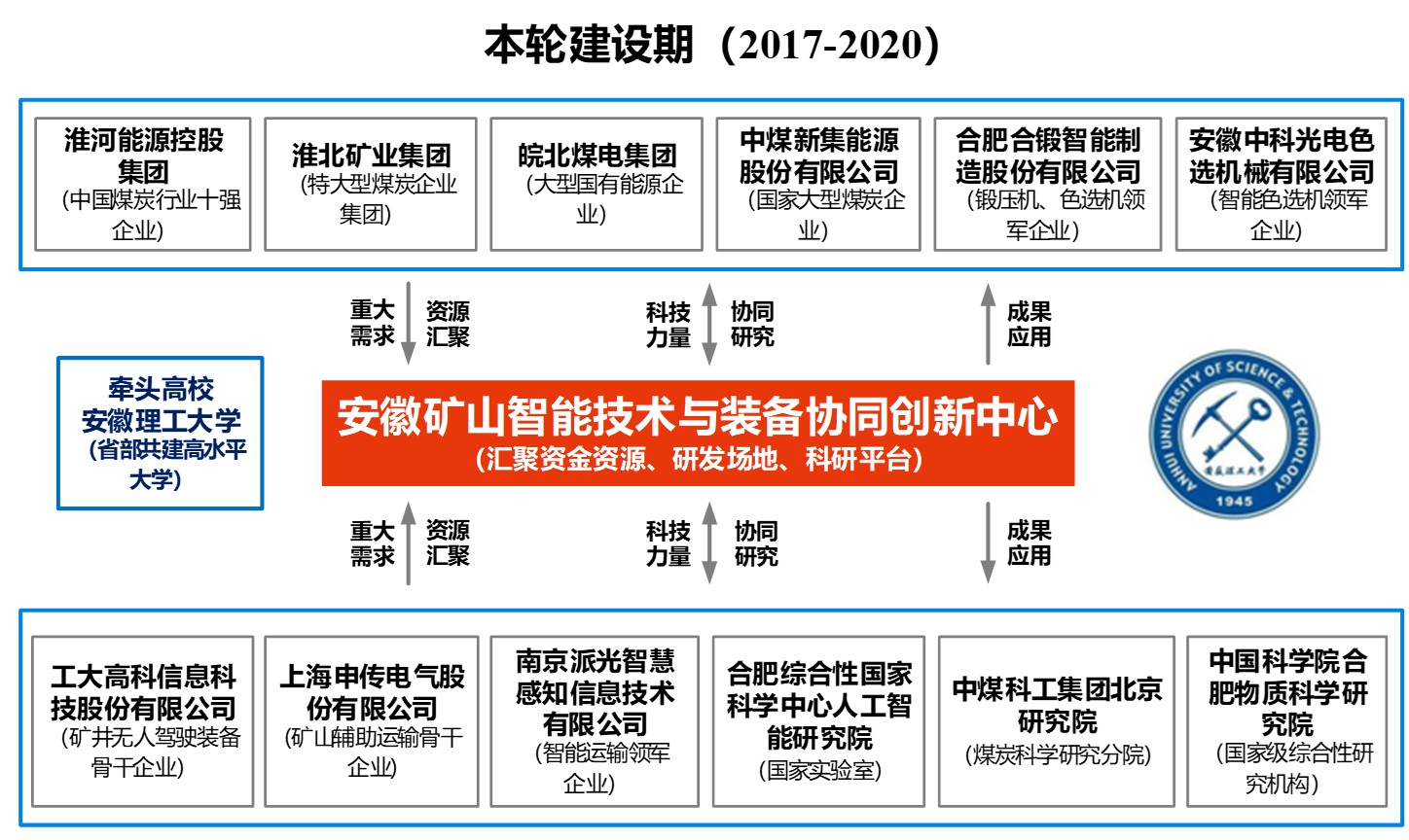 中心按照“政产学研用”模式,在省教育厅、经济和信息化厅、淮南市政府等部门的关心和指导下,联合合肥综合性国家科学中心人工智能研究院、中煤科工集团煤炭科学研究院、国家级综合研究机构-合肥物质科学研究院、矿井无人驾驶装备领军企业-工大高科信息科技股份有限公司、矿山辅助运输骨干企业-上海申传电气股份有限公司、智能运输装备领军企业-南京派光智慧感知信息技术有限公司、特大型煤炭企业集团用户-淮河能源控股集团、淮北矿业集团、皖北煤电集团等顶尖研发企业及用户联合组建。