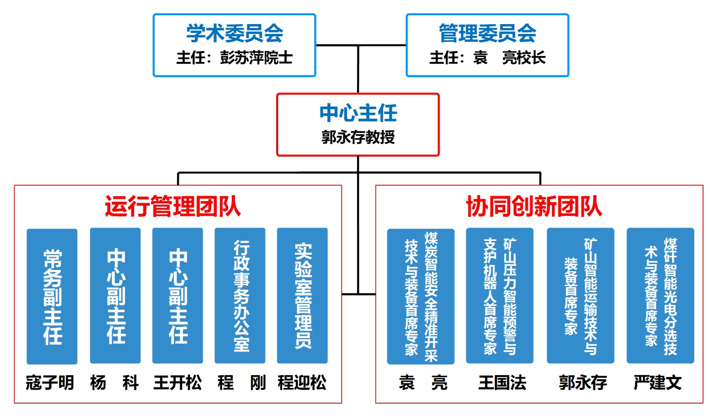 中心设立学术委员会、管理委员会。学术委员会提供学术决策咨询,设主任1名,由中国工程院院士、我校学术委员会主任彭苏萍教授担任,实行学术委员会指导下的主任负责制。中心设立管理委员会,职能是研究解决中心建设支撑保障方面问题,设主任1名,由中国工程院院士、校长袁亮教授担任。中心设主任1名、常务副主任1名、副主任2名,设立行政事务办公室。具体运行模式为: