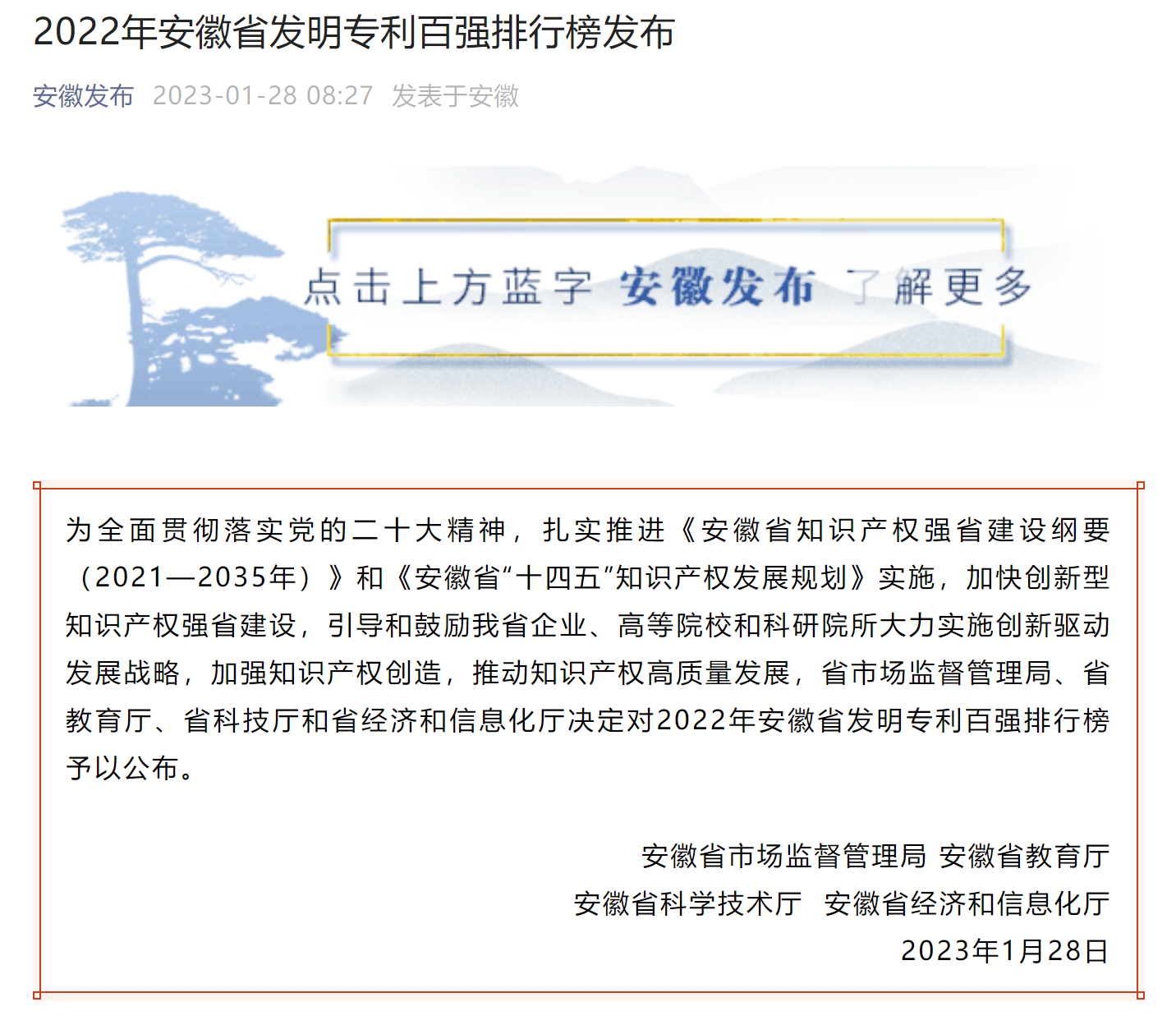 1月28日,省市场监管局、省教育厅、省科技厅和省经济信息化厅联合发布了《2022年安徽省发明专利百强排行榜》。省百强榜于2015年首次将高校列入榜单,我校继2020年第11位,2021年第9位后,今年跃升至总排名第8位,高校排名第3位,仅次于合肥工业大学和中国科学技术大学,位列省属高校第1名。